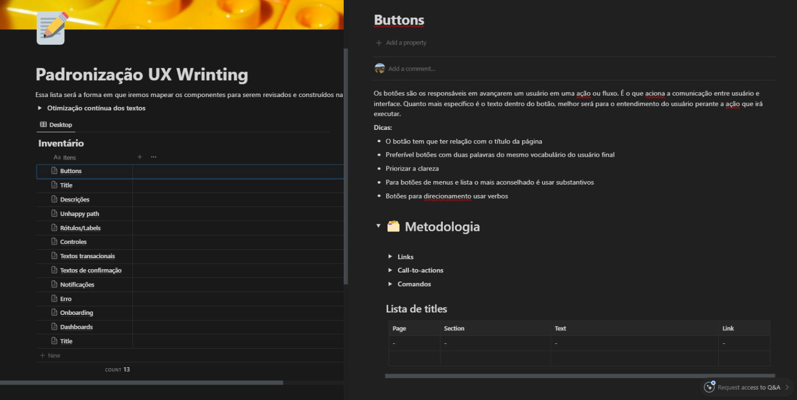 Foi desenvolvida uma documentação para unificar todos os textos da plataforma, sendo atualizada diariamente por todos os designers. O objetivo é garantir uma visão detalhada de cada componente ou área de texto, mantendo a mesma linguagem e coerência em toda a plataforma. Esta documentação é segmentada por componentes e áreas de texto (modais, títulos, subtítulos), cada uma com orientações de uso e regras específicas para cada contexto.